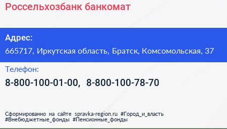 Россельхозбанк, банкомат по адресу 665717, Иркутская область, Братск, Комсомольская, 37 в дальнейшем Организация, размещена в следующих категориях: