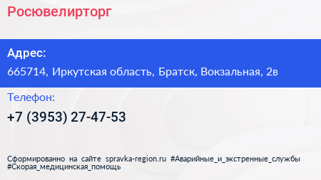 Росювелирторг по адресу 665714, Иркутская область, Братск, Вокзальная, 2в в дальнейшем Организация, размещена в следующих категориях: