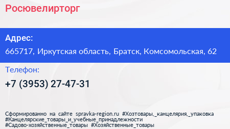Росювелирторг по адресу 665717, Иркутская область, Братск, Комсомольская, 62 в дальнейшем Организация, размещена в следующих категориях: