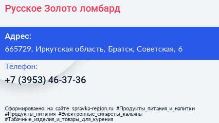 Русское Золото, ломбард по адресу 665729, Иркутская область, Братск, Советская, 6 в дальнейшем Организация, размещена в следующих категориях: