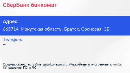 СберБанк, банкомат по адресу 665714, Иркутская область, Братск, Сосновая, 3Б в дальнейшем Организация, размещена в следующих категориях:
