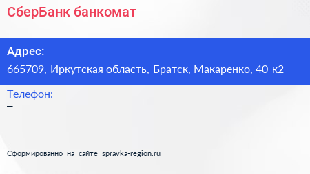СберБанк, банкомат по адресу 665709, Иркутская область, Братск, Макаренко, 40 к2 в дальнейшем Организация, размещена в следующих категориях: