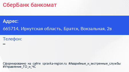 СберБанк, банкомат по адресу 665714, Иркутская область, Братск, Вокзальная, 2в в дальнейшем Организация, размещена в следующих категориях: