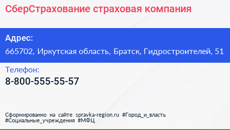 СберСтрахование, страховая компания по адресу 665702, Иркутская область, Братск, Гидростроителей, 51 в дальнейшем Организация, размещена в следующих категориях: