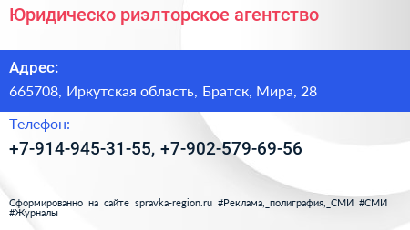 Юридическо-риэлторское агентство по адресу 665708, Иркутская область, Братск, Мира, 28 в дальнейшем Организация, размещена в следующих категориях: