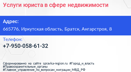 Услуги юриста в сфере недвижимости по адресу 665776, Иркутская область, Братск, Ангарстроя, 8 в дальнейшем Организация, размещена в следующих категориях: