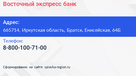 Восточный экспресс банк по адресу 665714, Иркутская область, Братск, Енисейская, 64Б в дальнейшем Организация, размещена в следующих категориях:
