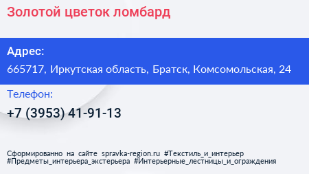Золотой цветок, ломбард по адресу 665717, Иркутская область, Братск, Комсомольская, 24 в дальнейшем Организация, размещена в следующих категориях: