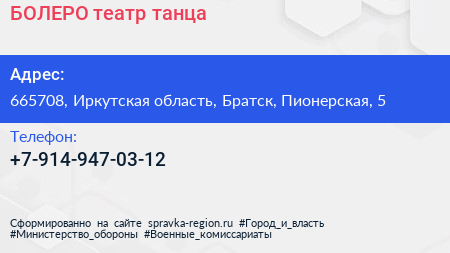 БОЛЕРО, театр танца по адресу 665708, Иркутская область, Братск, Пионерская, 5 в дальнейшем Организация, размещена в следующих категориях:
