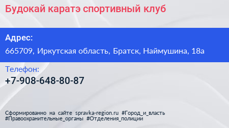 Будокай каратэ, спортивный клуб по адресу 665709, Иркутская область, Братск, Наймушина, 18а в дальнейшем Организация, размещена в следующих категориях: