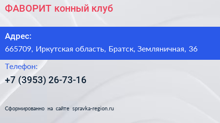 ФАВОРИТ, конный клуб по адресу 665709, Иркутская область, Братск, Земляничная, 36 в дальнейшем Организация, размещена в следующих категориях: