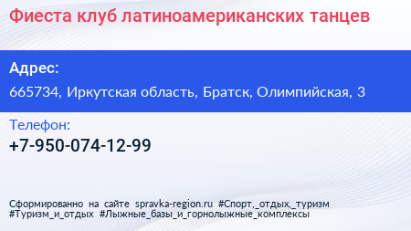 Фиеста, клуб латиноамериканских танцев по адресу 665734, Иркутская область, Братск, Олимпийская, 3 в дальнейшем Организация, размещена в следующих категориях: