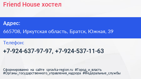 Friend House, хостел по адресу 665708, Иркутская область, Братск, Южная, 39 в дальнейшем Организация, размещена в следующих категориях:
