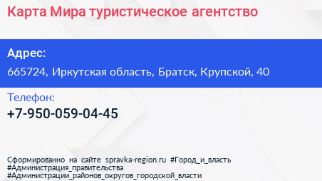 Карта Мира, туристическое агентство по адресу 665724, Иркутская область, Братск, Крупской, 40 в дальнейшем Организация, размещена в следующих категориях: