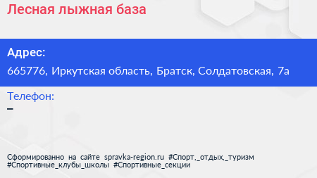 Лесная, лыжная база по адресу 665776, Иркутская область, Братск, Солдатовская, 7а в дальнейшем Организация, размещена в следующих категориях: