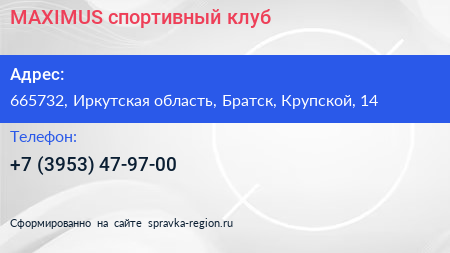 MAXIMUS, спортивный клуб по адресу 665732, Иркутская область, Братск, Крупской, 14 в дальнейшем Организация, размещена в следующих категориях: