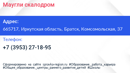 Маугли, скалодром по адресу 665717, Иркутская область, Братск, Комсомольская, 37 в дальнейшем Организация, размещена в следующих категориях: