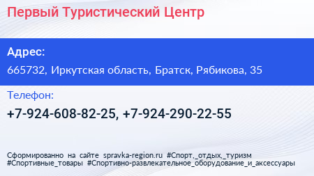 Первый Туристический Центр по адресу 665732, Иркутская область, Братск, Рябикова, 35 в дальнейшем Организация, размещена в следующих категориях: