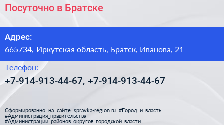 Посуточно в Братске по адресу 665734, Иркутская область, Братск, Иванова, 21 в дальнейшем Организация, размещена в следующих категориях: