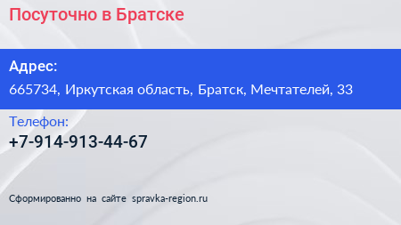 Посуточно в Братске по адресу 665734, Иркутская область, Братск, Мечтателей, 33 в дальнейшем Организация, размещена в следующих категориях: