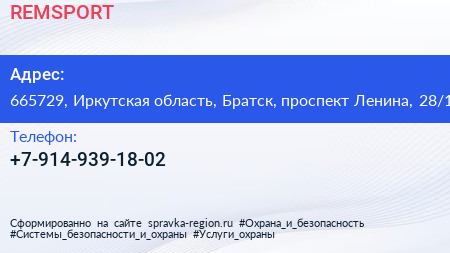 REMSPORT по адресу 665729, Иркутская область, Братск, проспект Ленина, 28/1 в дальнейшем Организация, размещена в следующих категориях: