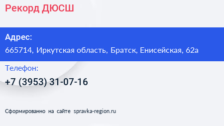 Рекорд, ДЮСШ по адресу 665714, Иркутская область, Братск, Енисейская, 62а в дальнейшем Организация, размещена в следующих категориях: