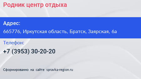 Родник, центр отдыха по адресу 665776, Иркутская область, Братск, Заярская, 6а в дальнейшем Организация, размещена в следующих категориях: