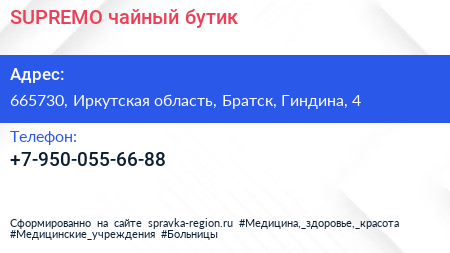 SUPREMO, чайный бутик по адресу 665730, Иркутская область, Братск, Гиндина, 4 в дальнейшем Организация, размещена в следующих категориях: