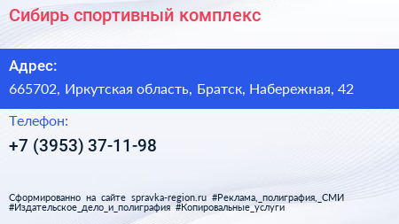 Сибирь, спортивный комплекс по адресу 665702, Иркутская область, Братск, Набережная, 42 в дальнейшем Организация, размещена в следующих категориях: