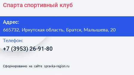 Спарта, спортивный клуб по адресу 665732, Иркутская область, Братск, Малышева, 20 в дальнейшем Организация, размещена в следующих категориях: