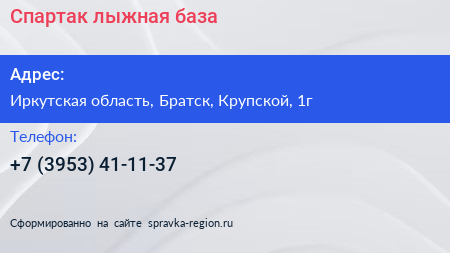 Спартак, лыжная база по адресу Иркутская область, Братск, Крупской, 1г в дальнейшем Организация, размещена в следующих категориях: