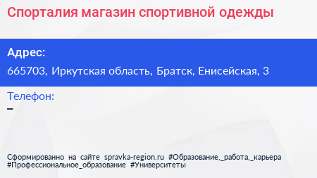 Спорталия, магазин спортивной одежды по адресу 665703, Иркутская область, Братск, Енисейская, 3 в дальнейшем Организация, размещена в следующих категориях: