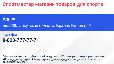 Спортмастер, магазин товаров для спорта по адресу 665708, Иркутская область, Братск, Кирова, 19 в дальнейшем Организация, размещена в следующих категориях: