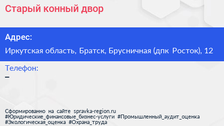 Старый конный двор по адресу Иркутская область, Братск, Брусничная (дпк Росток), 12 в дальнейшем Организация, размещена в следующих категориях: