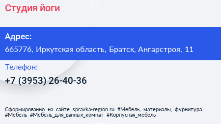 Студия йоги по адресу 665776, Иркутская область, Братск, Ангарстроя, 11 в дальнейшем Организация, размещена в следующих категориях: