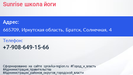 Sunrise, школа йоги по адресу 665709, Иркутская область, Братск, Солнечная, 4 в дальнейшем Организация, размещена в следующих категориях: