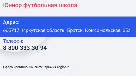Юниор, футбольная школа по адресу 665717, Иркутская область, Братск, Комсомольская, 35а в дальнейшем Организация, размещена в следующих категориях: