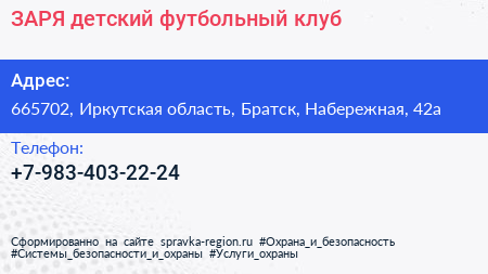 ЗАРЯ, детский футбольный клуб по адресу 665702, Иркутская область, Братск, Набережная, 42а в дальнейшем Организация, размещена в следующих категориях: