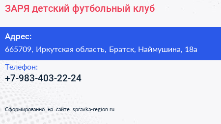 ЗАРЯ, детский футбольный клуб по адресу 665709, Иркутская область, Братск, Наймушина, 18а в дальнейшем Организация, размещена в следующих категориях: