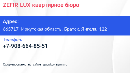 ZEFIR LUX, квартирное бюро по адресу 665717, Иркутская область, Братск, Янгеля, 122 в дальнейшем Организация, размещена в следующих категориях: