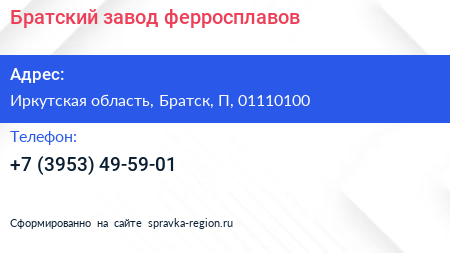 Братский завод ферросплавов по адресу Иркутская область, Братск, П, 01110100 в дальнейшем Организация, размещена в следующих категориях:
