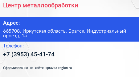 Центр металлообработки по адресу 665708, Иркутская область, Братск, Индустриальный проезд, 1а в дальнейшем Организация, размещена в следующих категориях: