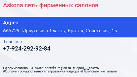 Askona, сеть фирменных салонов по адресу 665729, Иркутская область, Братск, Советская, 15 в дальнейшем Организация, размещена в следующих категориях: