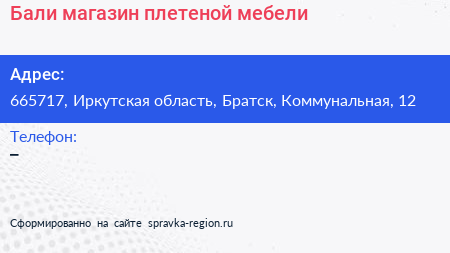 Бали, магазин плетеной мебели по адресу 665717, Иркутская область, Братск, Коммунальная, 12 в дальнейшем Организация, размещена в следующих категориях:
