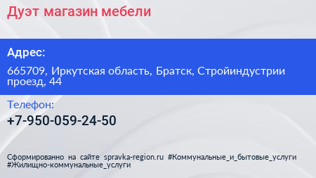 Дуэт, магазин мебели по адресу 665709, Иркутская область, Братск, Стройиндустрии проезд, 44 в дальнейшем Организация, размещена в следующих категориях: