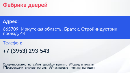 Фабрика дверей по адресу 665709, Иркутская область, Братск, Стройиндустрии проезд, 44 в дальнейшем Организация, размещена в следующих категориях: