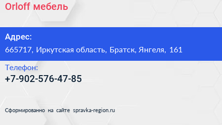 Orloff-мебель по адресу 665717, Иркутская область, Братск, Янгеля, 161 в дальнейшем Организация, размещена в следующих категориях: