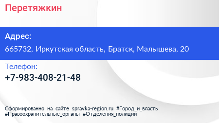 Перетяжкин по адресу 665732, Иркутская область, Братск, Малышева, 20 в дальнейшем Организация, размещена в следующих категориях:
