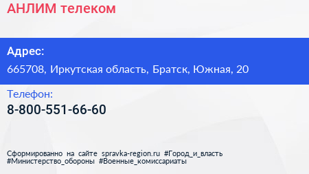 АНЛИМ телеком по адресу 665708, Иркутская область, Братск, Южная, 20 в дальнейшем Организация, размещена в следующих категориях: