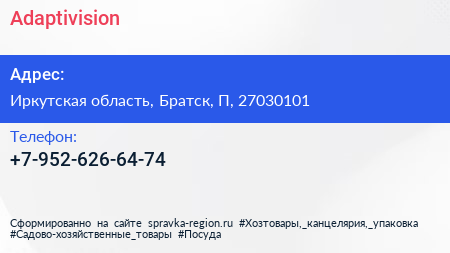 Adaptivision по адресу Иркутская область, Братск, П, 27030101 в дальнейшем Организация, размещена в следующих категориях: